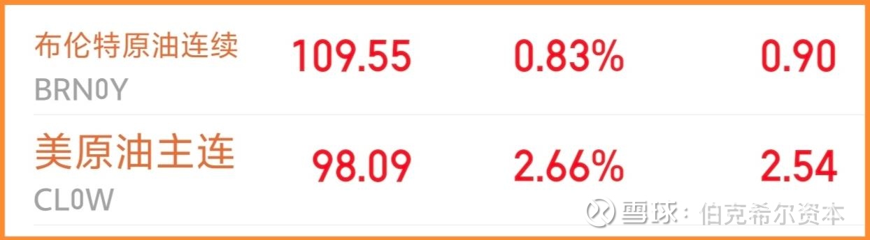 我们周五凌晨报道了全球原油期货以及美国油气板块持续上涨之后(网页链接),昨天晚上美国周五盘间布伦特原油以及美国 WTI 原油指数双双继续上攻,WTI 收盘再度逼近100元,估计下周这层窗户纸很快会被捅破。布伦特原油美东时间 4:30 收盘的时候是在112块多,但因为金毛盘后又放了一些话企图缓和油价,因此短暂下探了一下到 107,但是立刻又弹上来接近110 了,下周也是一样会很快突破 110 继续上攻。
