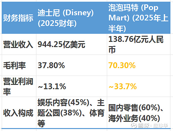 商业模式不同:迪士尼是全产业链的IP娱乐帝国,业务多元抗风险;泡泡玛特是垂直DTC潮玩零售商,模式轻但依赖单一品类。