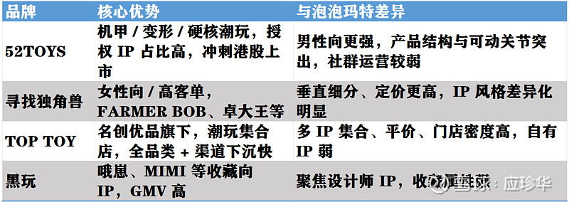 名创优品凭借其强大的供应链整合能力和遍布全球的门店网络,也在潮玩领域持续发力,推出了多款联名潮玩产品,以高性价比策略吸引消费者,进一步加剧了市场竞争。近年孵化了旗下潮玩子品牌TOPTOY申请于港股上市。但目前其IP主要还是授权居多,自有IP很少。从IP孵化,运营能力来看与泡泡玛特应该是存在一定差距的。