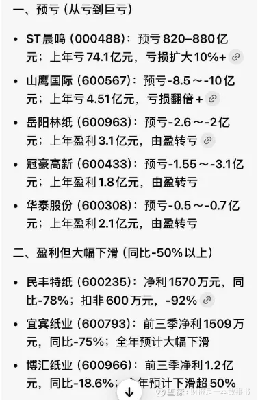 1)晨鸣纸业预亏820-880亿较去年同期亏损74.1亿元,亏损扩大10%;