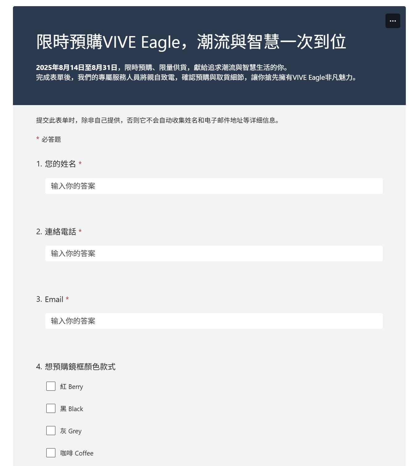 最后,关于购买信息,目前我们可以在官网上进行预购,根据官网信息,VIVE Eagle从8月14日到8月31日开启限时、限量供货,填表之后,会有相关人员联系确认取货细节,用户还可以选择线下门店体验和取货。