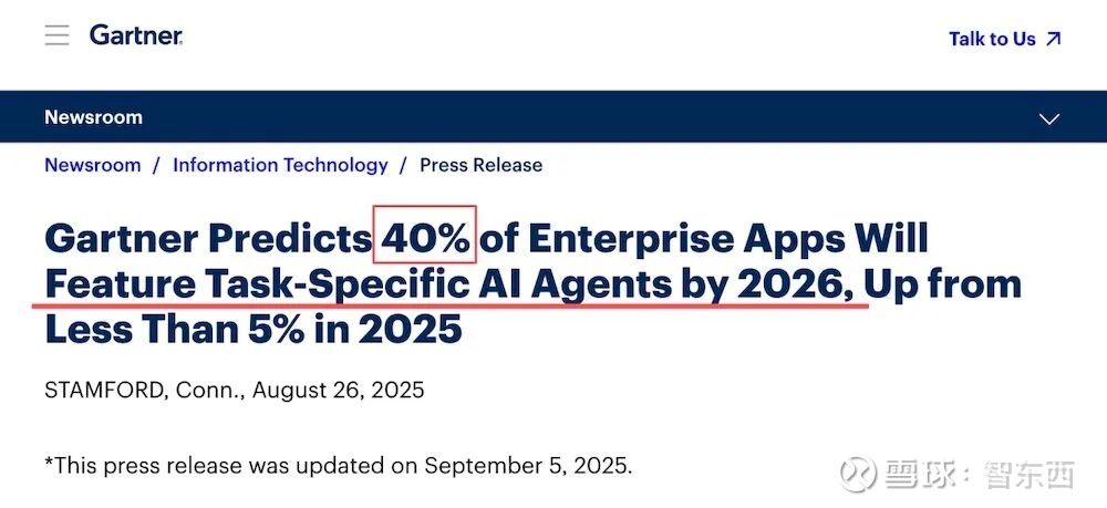 Gartner在2025年发布的预测显示,到2026年将有40%的企业应用集成任务型AI Agent,而在2025年这一比例还不足5%。