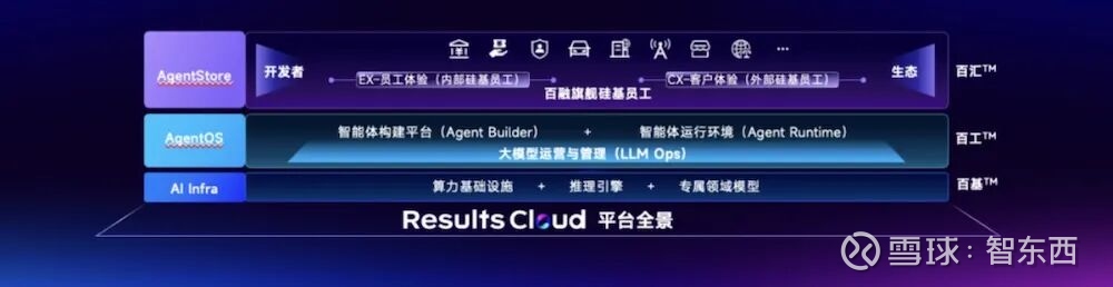 “结果云”由三层构成:底层的“百基”提供AI算力、推理引擎与专属模型;中间的“百工”是智能体操作系统,支持原子化能力的构建与调优;最上层的“百汇”则是Agent Store,内置了多个可直接调用的“硅基员工”。