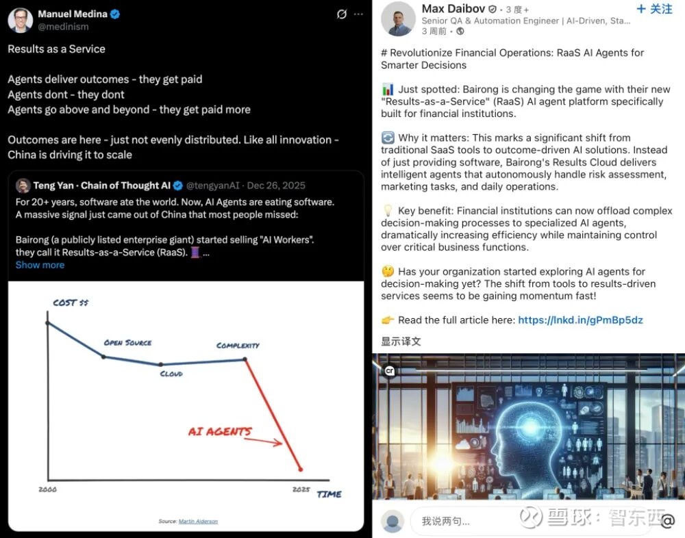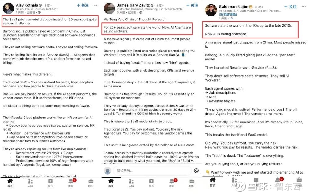 这一范式转变,正在被更广泛地讨论。近期,围绕“AI Workers”“ RaaS”和“Results Cloud”的讨论在LinkedIn、X、Facebook等平台持续发酵。“为机器打造HR系统”的说法频繁出现。