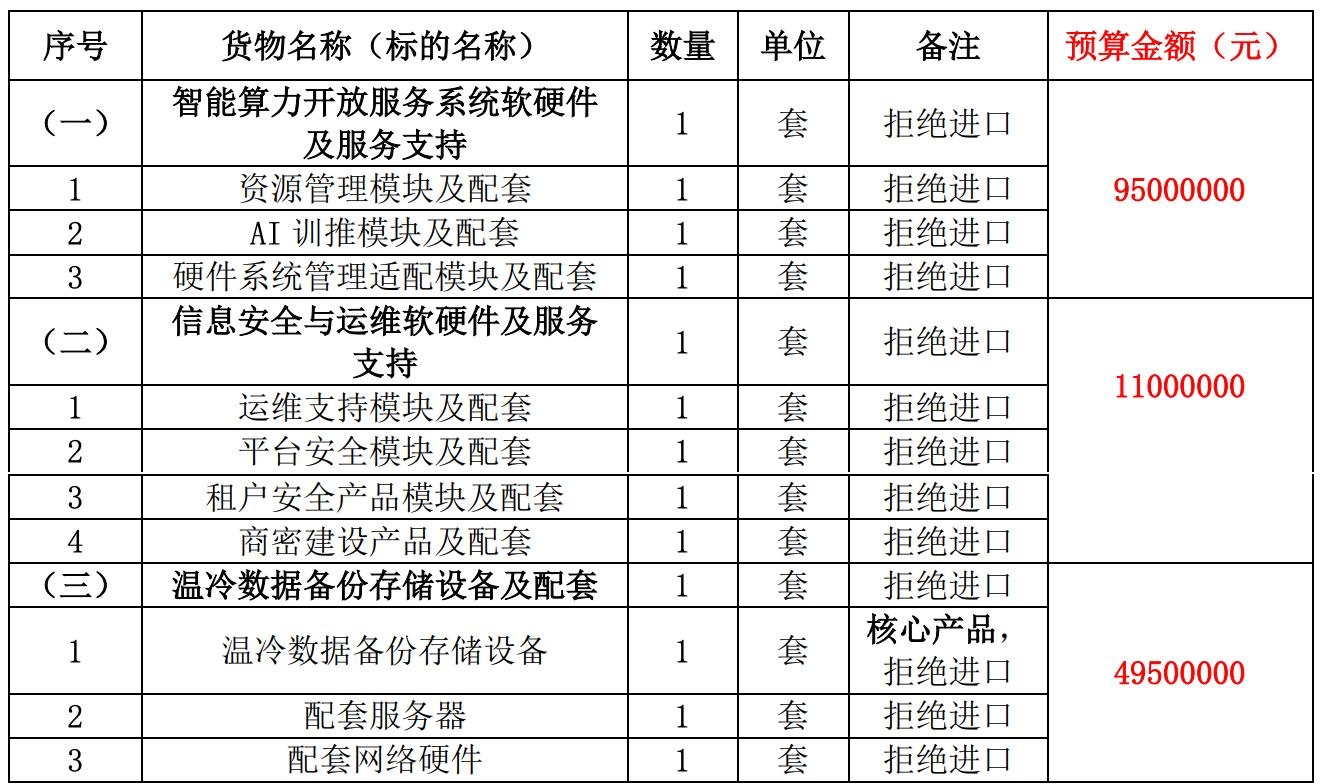 采购项目包括智能算力开放服务系统软硬件及服务支持、信息安全与运维软硬件及服务支持、温冷数据备份存储设备及配套,每一项货物名称都要求“拒绝进口”。