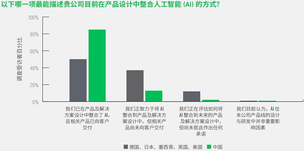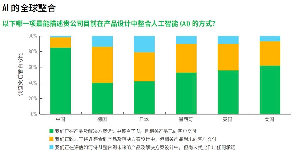 中国在产品AI技术整合方面表现突出,85%的受访者表示已实现AI产品量产,远超全球平均水平。