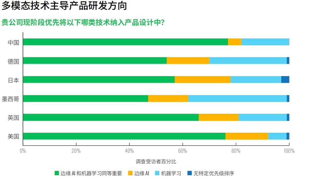 同时,工程师正也越来越重视边缘AI与机器学习的融合和协同应用。全球范围内有57%的受访者认为两者同等重要,这反映出多模态AI在亚太及全球市场的重要性正在不断提升。