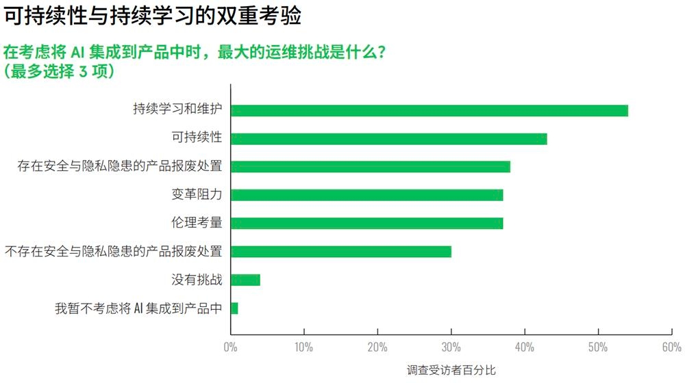 在运营层面,持续学习与维护(54%)以及可持续性(43%)等功能的重要性日益凸显,这与AI产品在功耗及全生命周期管理方面的要求密切相关。