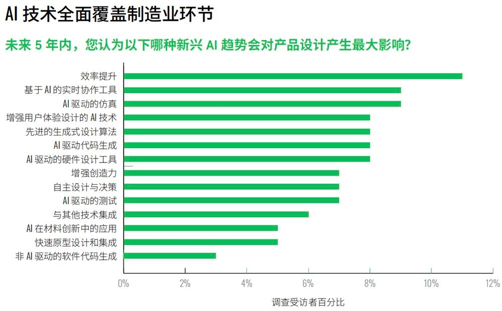96%的受访者都认同,未来3-5年内,AI赋能工具将重塑企业新产品的研发模式。不过,受访者对AI技术将对哪些具体流程产生最大影响的观点存在分歧。