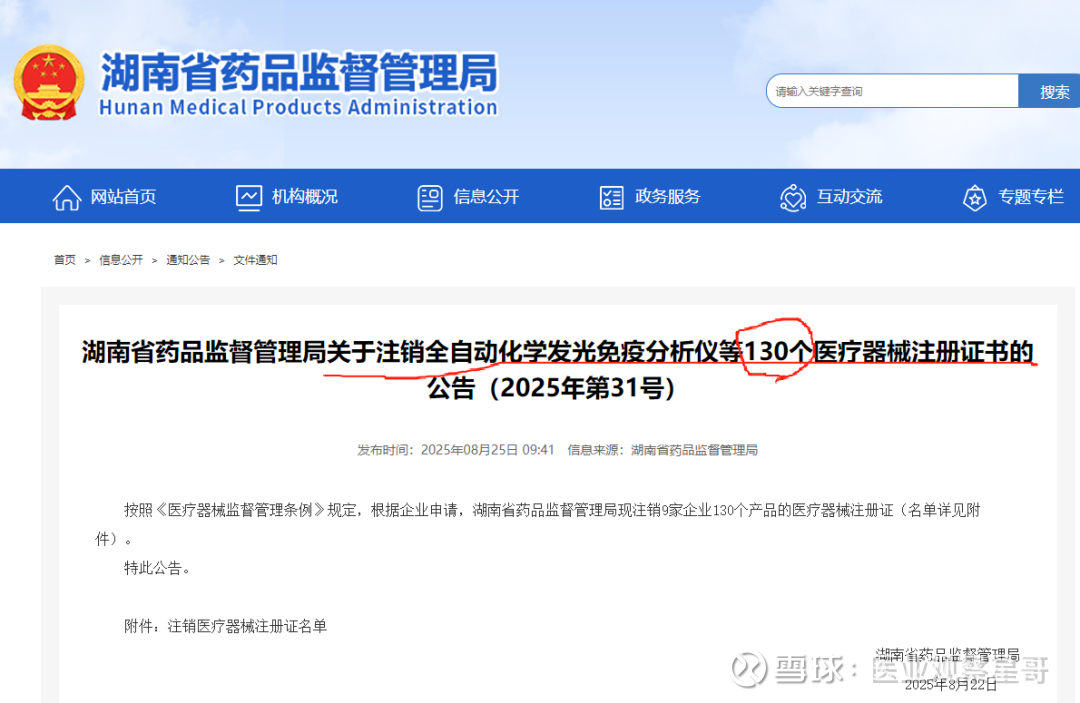 2025年08月25日,湖南省药品监督管理局发布关于注销全自动化学发光免疫分析仪等130个医疗器械注册证书的公告。根据9家企业申请,湖南省药品监督管理局现注销9家企业130个产品的医疗器械注册证。