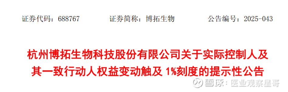 2025年11月21日,博拓生物发布关于实际控制人及其一致行动人权益变动触及1%刻度的提示性公告。