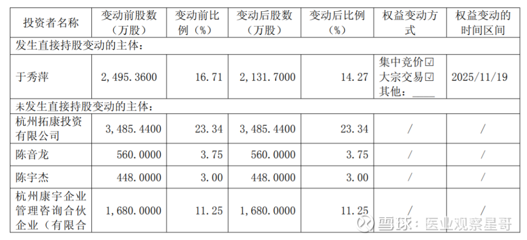 2025 年 11 月 19 日,于秀萍女士通过集中竞价交易(含盘后固定价格交易,下同)和大宗交易的方式合计减持公司股份 3,636,600 股,占公司当前总股本的2.44%。于秀萍女士及其一致行动人合计持有的公司股份数量由 86,688,000 股减少至 83,051,400 股,占公司总股本的比例由 58.05%减少至 55.61%,权益变动触及 1%的整数倍。