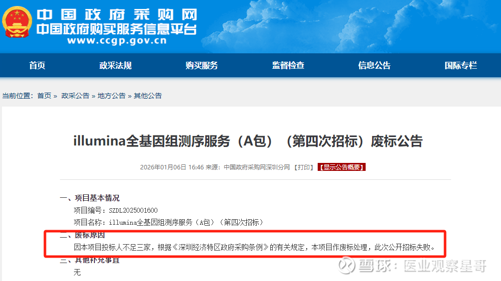 近日,医业观察 编辑凯莉注意到中国政府采购网平台发布一则废标公告:illumina全基因组测序服务(A包)(第四次招标)废标公告。