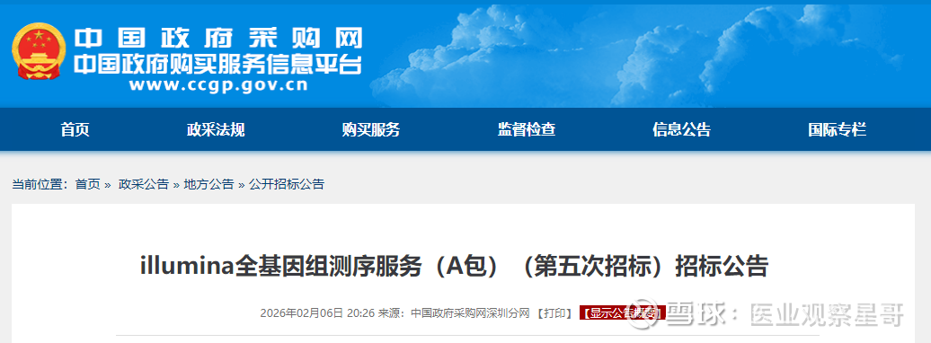 2026年02月06日,中国政府采购网发布illumina全基因组测序服务(A包)(第五次招标)招标公告。