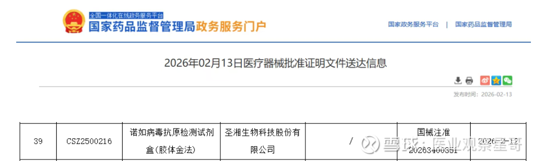 2月13日,国家药监局官网一则不起眼的信息,圣湘生物的诺如病毒抗原检测试剂盒(胶体金法)正式获证。