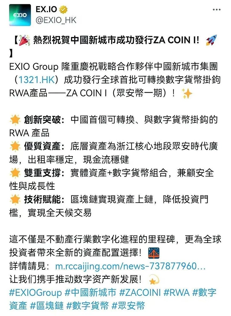 香港上市公司中国新城市集团有限公司(股票代码:1321.HK,下称“本集团”)宣布,已成功完成全球发行ZA-I(众安币一期)。这是中国首个可转换、与数字货币挂钩的RWA(实物资产上链)产品,在全球范围内首次实现了实体资产与数字货币的深度融合。