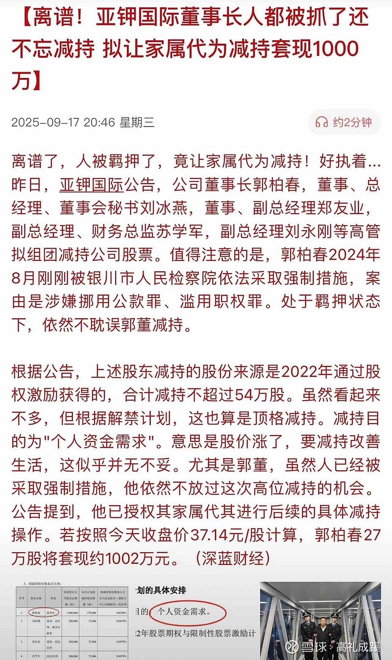 $亚钾国际(SZ000893)$ 董事长:人在看守所,减持KPI照冲!这波操作我给99分(少1分怕他骄傲)