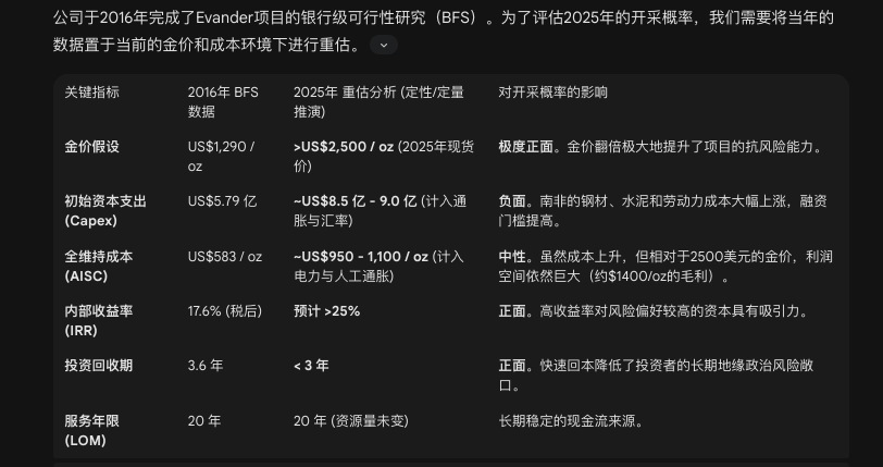 公司于2016年完成了Evander项目的银行级可行性研究(BFS)。为了评估2025年的开采概率,我们需要将当年的数据置于当前的金价和成本环境下进行重估。