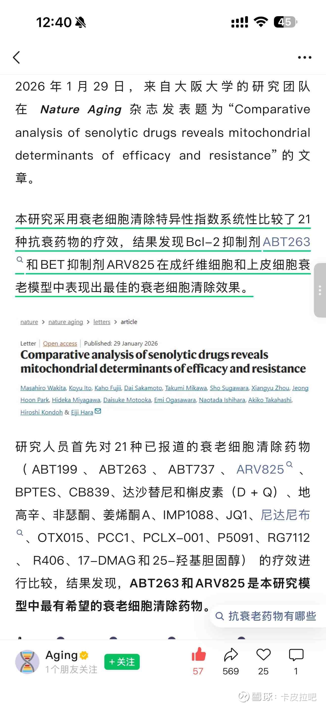昨天有亚粉问可能有什么超预期的利好,按照昨天的评论的思路,发现还真有人研究bcl2抑制剂在抗衰老上的作用联想一下西地那非最初只是心血管药物,却意外成为了男科神药伟哥。而亚盛的2575具有最明显的低毒性优势,或许能成为副作用最小的抗衰老神药,这才是超预期利好 $亚盛医药-B(06855)$网页链接