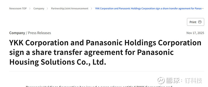 近日,松下控股宣布将旗下建材子公司Panasonic Housing Solutions(简称“PHS”)80%股权出售给日本建材巨头YKK集团,这一交易预计2026年3月底完成,2026年4月起PHS将以新体制运作。