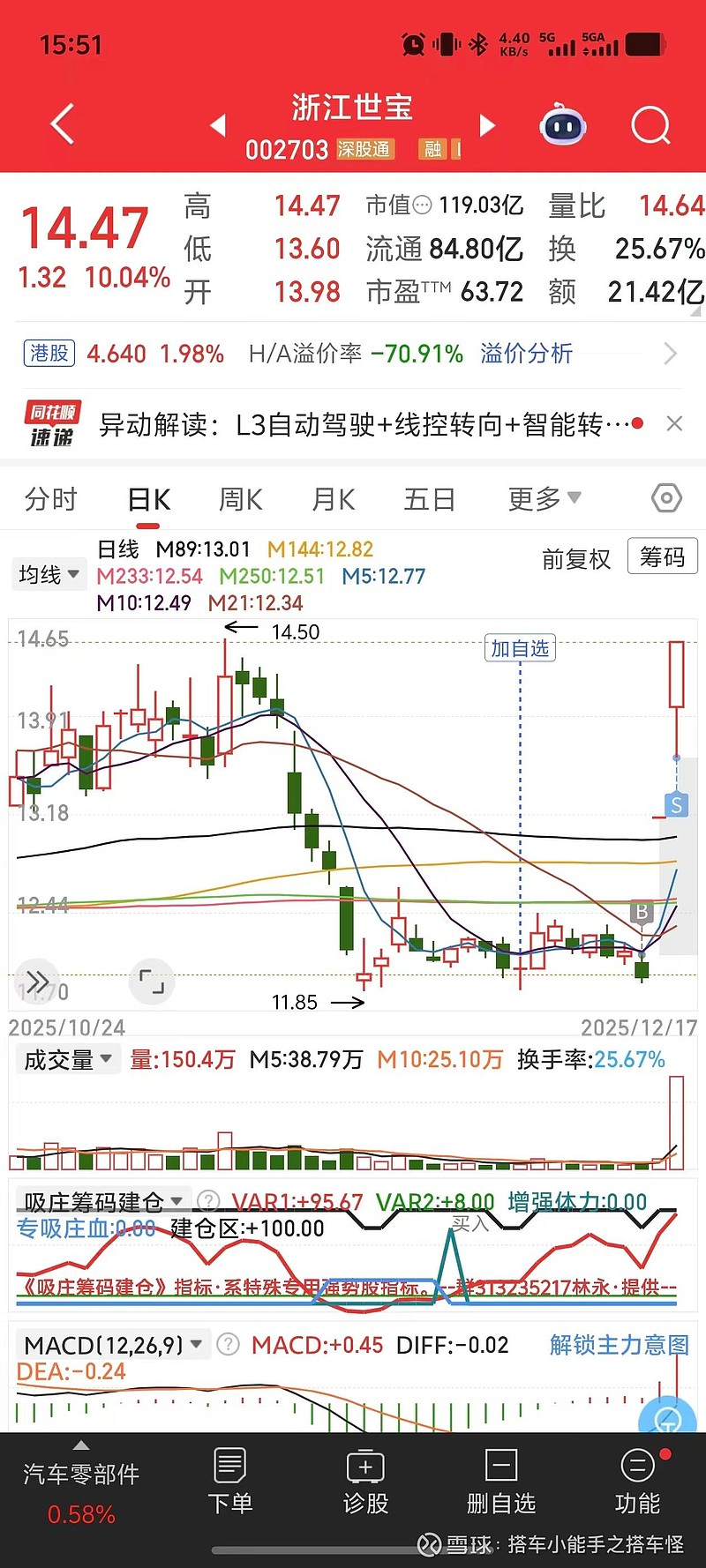 12月4号大侠的选股模型选出来$浙江世宝(SZ002703)$ ,这货今年4、5月份的时候大侠选出来过一回,可惜老怪我当时没子弹了,大侠自己倒是吃了两波。我也观察了半年,只要是有自动驾驶相关的风吹草动这货都得出来蹦跶几下。这次机会把握住了,启动前买入,不过今天被洗出去了
