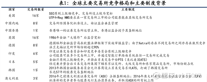作为证券交易的平台,交易所模式具有天然的平台经济特点,双边网络效应显著,随着时间的推移与资本市场的发展,可形成天然的垄断。然而,由于各国历史背景和法律、制度的不同,各个交易所之间垄断地位有所差别。例如,在美国由于高度开放的资本市场制度及为了尽可能减少交易成本,SEC对交易所的设立采取较为开放的态度;目前为止,美国境内共有16家全国性交易所。同时由于非上市交易特权(UTP)和全美市场系统规则(Regulation NMS)的存在,在一家交易所上市的公司股票可以在其他任何交易所完成交易,因此美国的交易所还面临来自其他交易所、BATS和暗池交易的激烈竞争。而在香港出于加强监管的需要,自1986年“四所合并”后港交所即作为香港唯一的证券交易所运营主体而被香港证监会赋予了垄断地位。