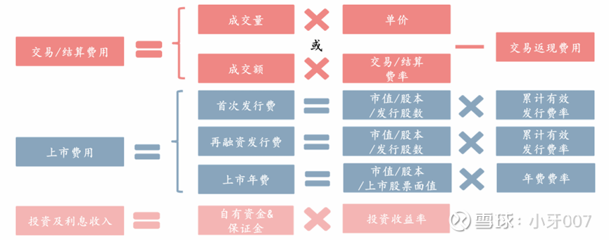 交易所的基础业务收入包括交易及结算费用、上市费用、投资及利息收入。1)交易及结算费用:作为证券交易的平台,交易所为交易双方提供证券交易和结算等一系列服务并收取一定费用。交易及结算费用通常基于成交量/成交额,按照一定的比例向挂单方(maker)/吃单方(taker)/交易双方收取。为吸引流动性,部分交易所还会为流动性提供者提供一定的交易返现。2)上市费用:交易所为公司提供挂牌上市等服务并收取一定费用;上市费用主要包括一次性的首发/再融资费用及持续的上市年费。3)投资及利息收入:为尽可能地消除交易对手风险,交易所和清算所通常会向市场参与者收取一定的保证金,而交易所则可以利用保证金池及自有资金进行投资并获取收益。