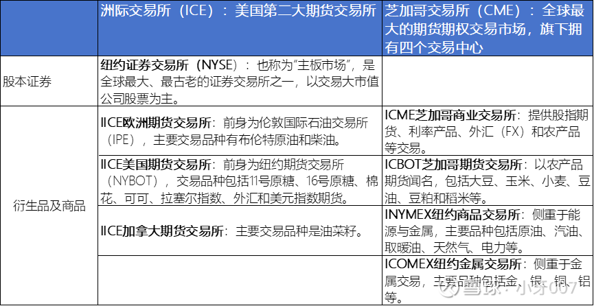 大部分上市交易所为股票交易所,其中洲际交易所和芝加哥交易所比较特别,主营衍生品及商品交易所业务,两者主营的品种也是差异化的竞争。