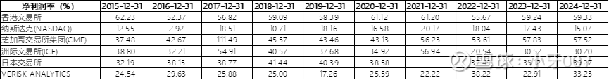 上述几家公司中,交易所能在大部分年份保持收入的增长,Verisk在过去10年都保持正增长;盈利方面,交易所由于轻资产的模式以及竞争格局好,可以保持较高的利润率,其中港交所和芝加哥交易所利润率都高于50%,纳斯达克由于竞争激烈以及业务结构的原因,净利润率最低。