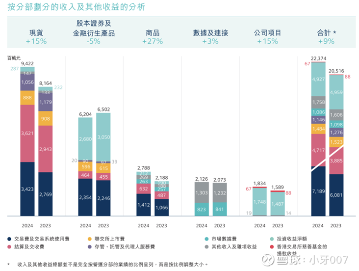 股本证券及金融衍生产品分部:收入来源于在联交所以及期交所交易的衍生产品的交易费、交易系统使用费、上市费以及保证金的投资净收益等。业绩驱动因素为各类衍生品的每日成交量(ADV)和息差。
