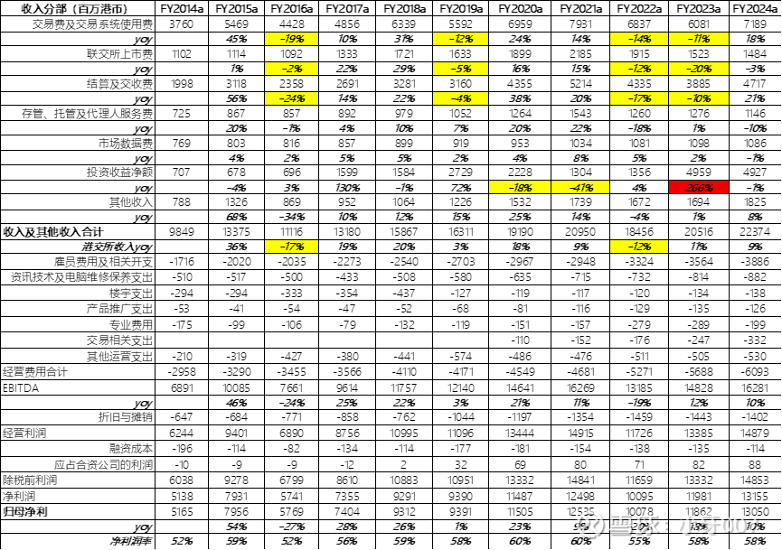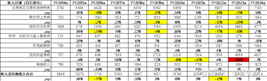 综上,长期内随着增量资金和上市公司的不断涌入,港股市场亦将持续扩充;因此在换手率整体较为稳定的情况下,随着港股总市值的不断增长港股成交金额中枢也会随之不断抬升,此为港交所长期成长性和能够显著跑赢市场大盘的根本来源。