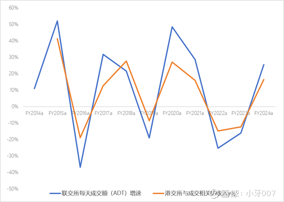港交所与成交相关的收入(交易、托管、结算以及上市)与联交所的成交额高度相关。