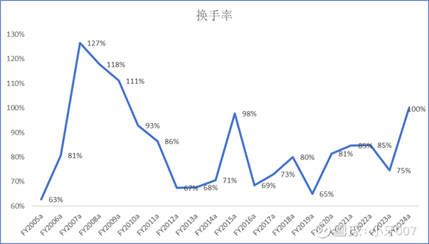 从换手率来看,在牛市中换手率具有很大的弹性。从趋势来看,近年来换手率的低点有所抬升,比如2012-2013年换手率的低位是在67%-68%,2023年换手率的低位为75%。