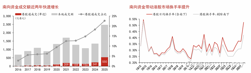 随着南向资金成交额近两年快速增长,并带动港股市场换手率提升。