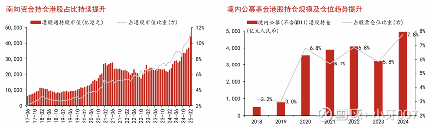 境内公募基金股票持仓中港股占比升至8%:截至2024年末,境内公募基金(不包含QDII基金)港股持仓市值超4900亿元人民币,占股票仓位比重7.8%,较5年前提升4.8pct。