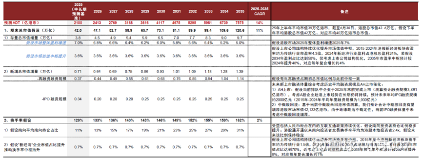 中金预测,未来十年港股ADT CAGR 达到14%,其中港股总市值CAGR达12%(其中存量公司盈利增长6%左右,估值提升3.6%,IPO及再融资新增市值1%-2%),换手率中枢提升贡献年化2%增速、由2025年129%提升至2035年162%。