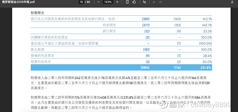 2025年上半年伦敦交易所铝价格上涨76.5美元每吨,但是由于卢布升值25%,把这部分利润抵消了。