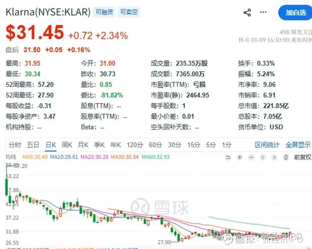 截至2026年1月9日,Klarna的股价收于31.45美元,较40.00美元的发行价下跌约21 %,较IPO发行价下跌8.45美元。该公司总市值约222亿美元,静态市盈率高达24645倍。