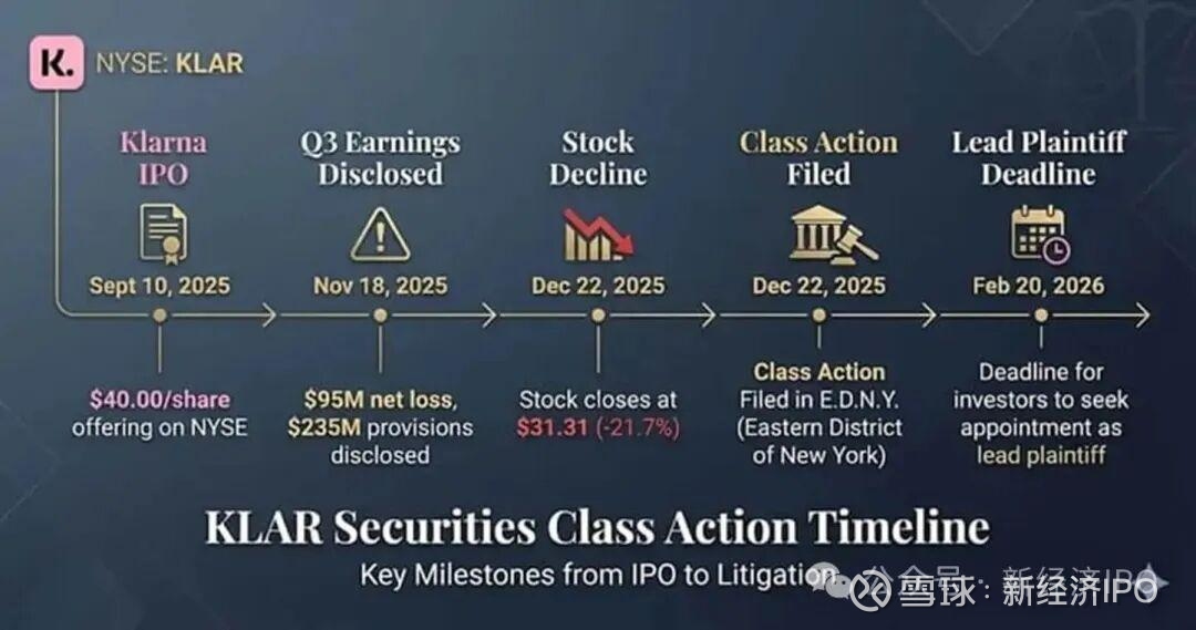 多起面向投资者的诉讼公告在2025年末至2026年初密集出现。原告律所提醒在特定期间买入Klarna股票并遭受损失的投资者,可以在2026年2月20日前申请成为首席原告。对于美股老玩家而言,这类“IPO后诉讼”并不罕见,甚至带着某种流水线气质;但Klarna这一次之所以引发更广泛的讨论,是因为指控没有停留在“未披露风险”这种空泛句式上,而是直接把争议聚焦在几组刺眼的数字上—尤其是那条让市场警觉的曲线:公司披露的信用损失计提同比大幅上升,相关口径被多家公告概括为“同比激增102%”。