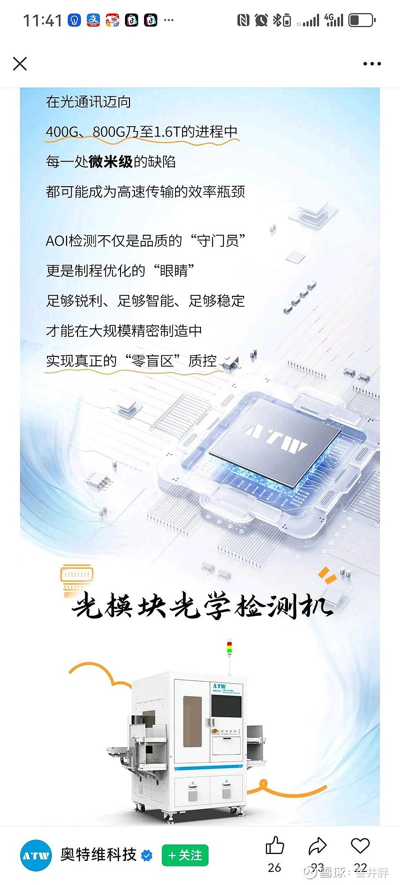 $应用光电(AAOI)$ 光模块后面行业景气度攀升,应用光电电话会议明年一个月业绩相当于去年一年的业绩。可以关注卖铲子的公司奥特维,公司25年年报实锤供货aaoi光模块检测设备,设备占光模块整体价值的20-30%,接下来如果光模块爆发,订单会继续增加。国外光模块业绩大涨,对于国内公司算小利空,属于竞争关系,不要一股脑冲国内光,设备公司更有确定性。