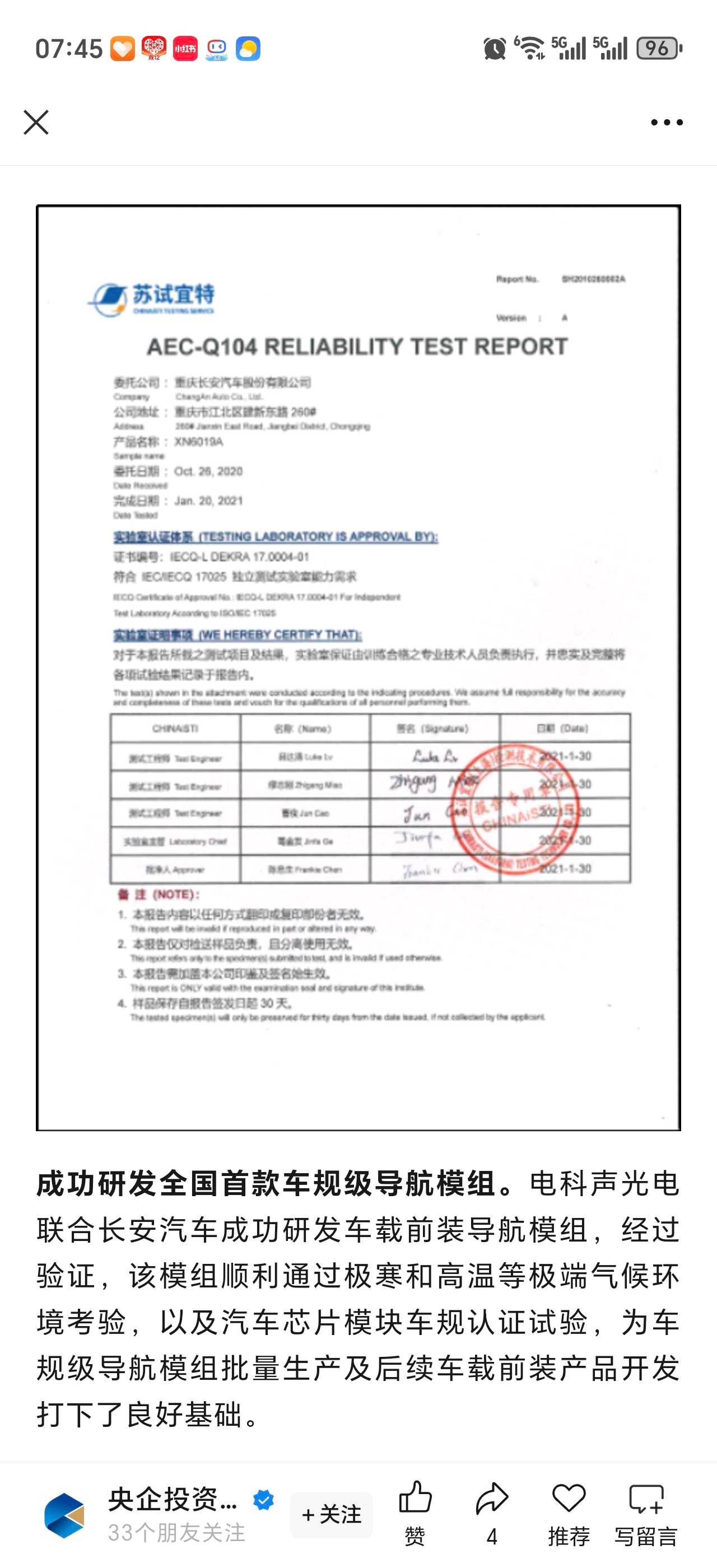 电科声光电联合长安汽车成功研发车载前装导航模组,经过验证,该模组顺利通过极寒和高温等极端气候环境考验,以及汽车芯片模块车规认证试验,为车规级导航模组批量生产及后续车载前装产品开发打下了良好基础。$电科芯片(SH600877)$ $东风股份(SH600006)$ $北汽蓝谷(SH600733)$