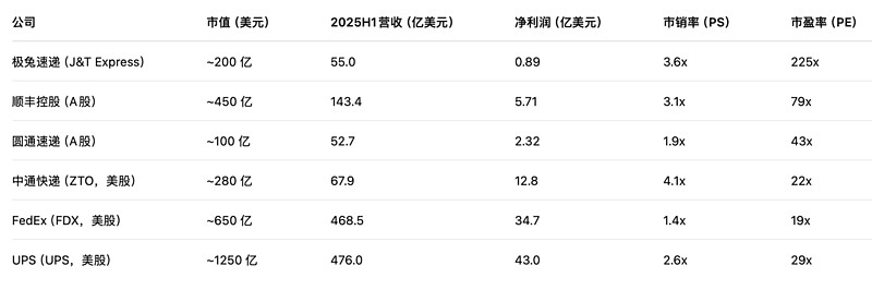 此外,从资本市场的角度来看,极兔的全球化布局已经让它逐渐具备与国内外快递龙头对标的意义。以下是一个简要的估值对比(数据均为2025年8月市值与公开财报口径):