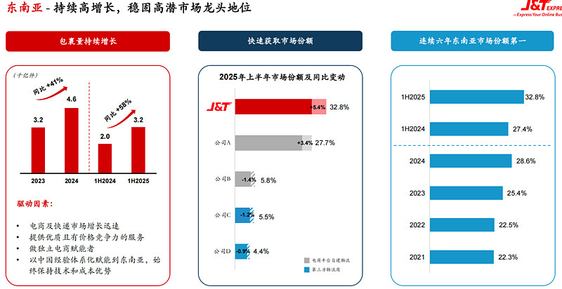 日趋成熟的东南亚模式,是极兔国际化策略的重要依托。凭借完善的物流网络、高性价比服务及领先的市场地位,极兔在东南亚的业务持续高速增长。作为公司的增长核心,上半年,极兔的东南亚业务表现尤为亮眼,区域包裹量大幅提升57.9%,市占率增至32.8%,连续六年保持第一。