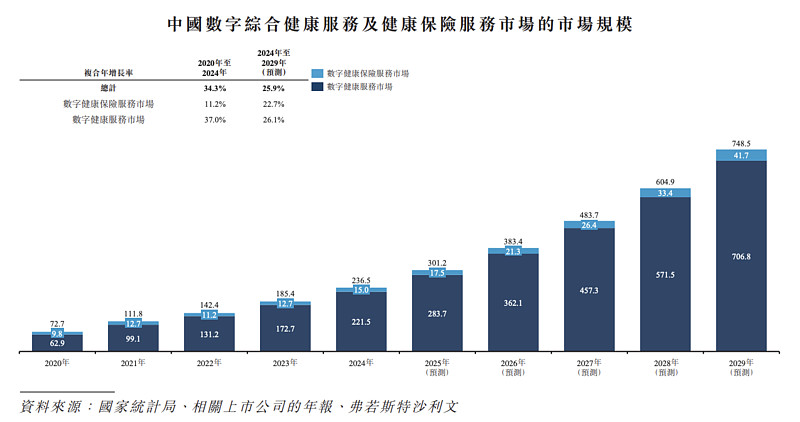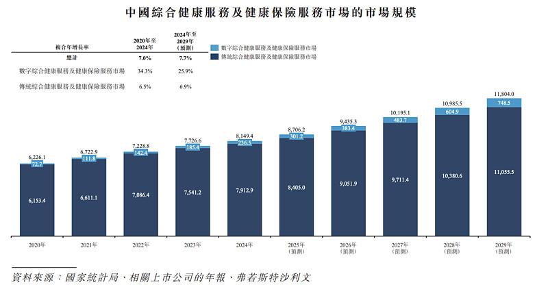 根据弗若斯特沙利文预测,2024–2029年中国综合健康服务及健康保险市场年复合增长率约7.7%。这不是一个爆发式赛道,但政策确定性高、需求稳定,适合能持续积累用户和数据的平台型公司。