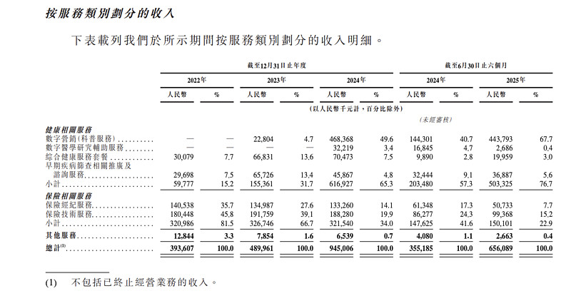 这一点在招股书中其实非常明确。公司围绕“预防—管理—保障”这条主线,搭建了两个核心业务板块:数字综合健康服务,以及数字综合保险服务。两者并不是并列关系,而是明显存在协同。