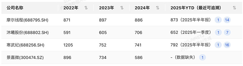 研发人员情况,摩尔线程截至2025H1的研发团队已达873人,在成立时间更短的前提下,规模已超过景嘉微、寒武纪,在全功能GPU(全功能GPU=通用GPU+图形GPU+AI芯片)路线上的人力与组织投入力度还是非常大的。
