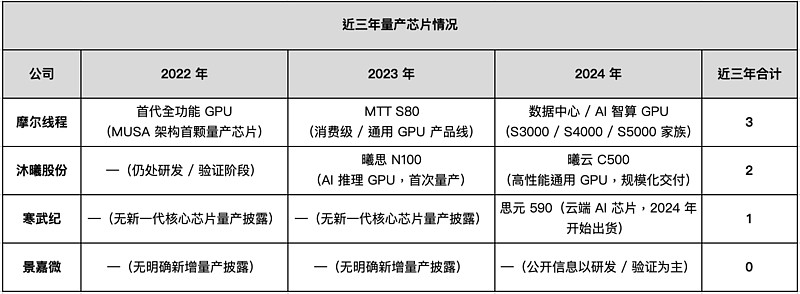 但从产品节奏这个维度去看,摩尔线程在2022–2024三年里,每一年都有定位清晰的核心GPU进入量产阶段,业内有“摩尔速度”一说。而且产品线从通用、消费级一路延伸到数据中心与AI智算,这种“连续爬坡”的节奏在国产GPU阵营里并不多见。