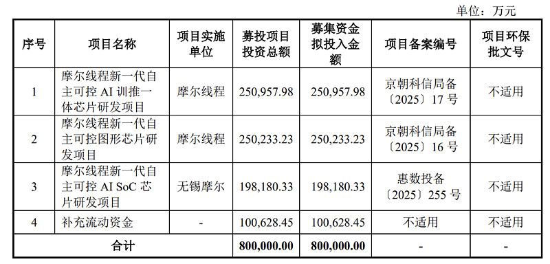 募投资金投资项目情况,摩尔线程募集80亿,扣除发行费等,实际到到手75.76亿。