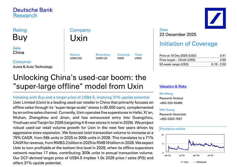 刚看到德银发了份关于优信$优信(UXIN)$ 的报告,首次覆盖,给了买入评级,目标价4.5美元,对应当下股价,大概还有30%左右的空间。