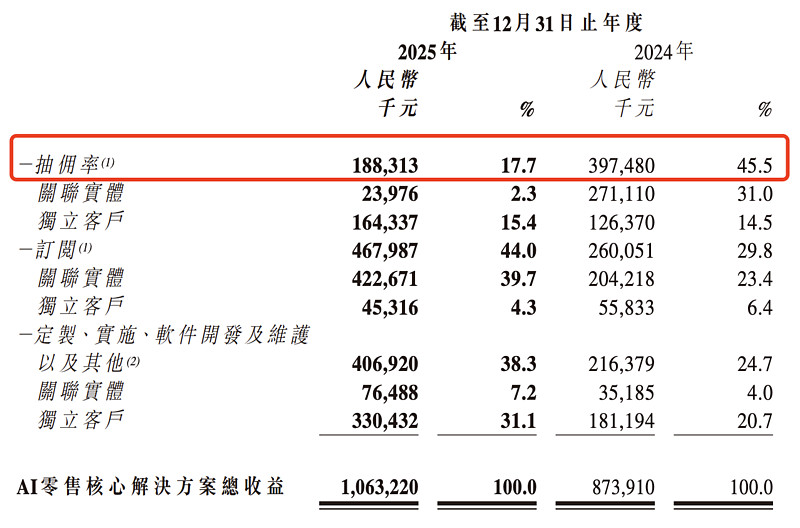 因为公司过去参与只是零售交易过程,收入以GMV抽佣为主,AI零售核心解决方案统一口径下2024年抽佣收入高达45.5%。